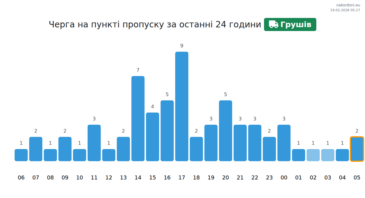 На ГКПП Грушив за камиони се очаква време за изчакване 15-375 минути. Избягвайте пиковите часове: 22:00, 00:00 и 01:00. Най-кратките опашки обикновено са в 02:00, 03:00 и 14:00.