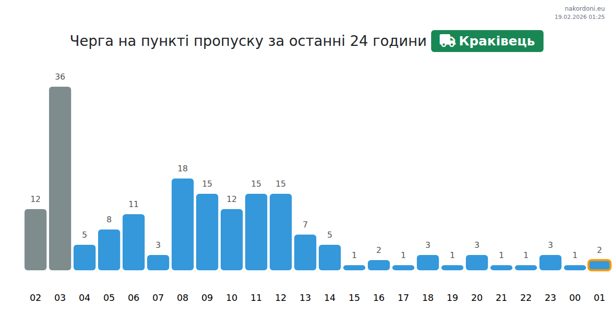 Прогнозата за Кракивець показва време за изчакване от 15 до 4455 минути. За да избегнете дълги опашки, препоръчваме да избягвате пиковите часове: 10:00, 08:00 и 01:00. Най-доброто време за преминаване е 02:00, 03:00 и 04:00.