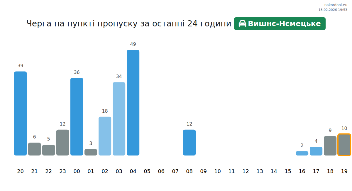 На Вишне-Немецьке очаквайте 15-53 мин. изчакване за леки коли. Избягвайте пиковите часове 04:00, 19:00, 23:00. За по-кратки опашки, преминавайте в 01:00, 00:00, 02:00.