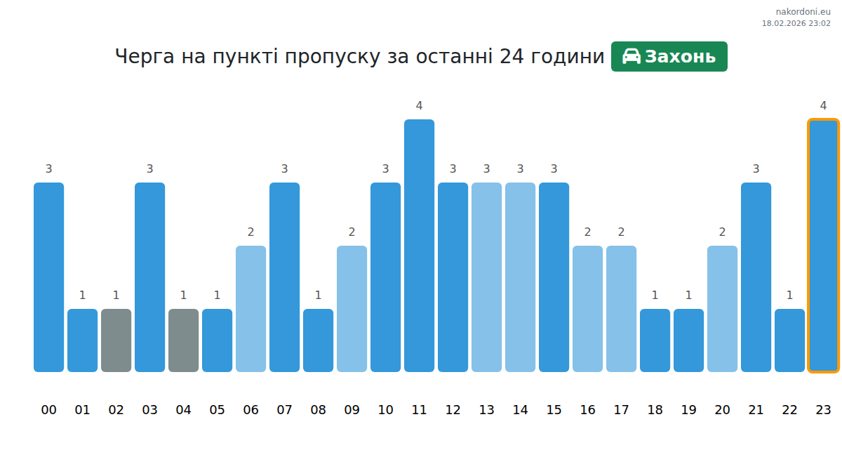 Времето за изчакване на Захон за леки автомобили е между 21-33 минути. Избягвайте пиковите часове в 10:00, 12:00 и 11:00. Най-добрите часове за преминаване са 13:00, 14:00 и 15:00.