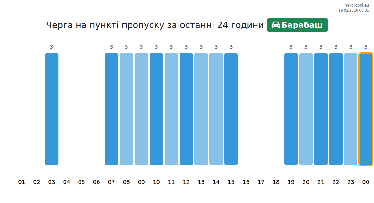 На ГКПП Барабаш времето за изчакване за леки автомобили е 15-135 минути. Избягвайте пиковите часове: 08:00, 10:00, 16:00. За по-кратки опашки пресичайте след 20:00, 21:00, 22:00.