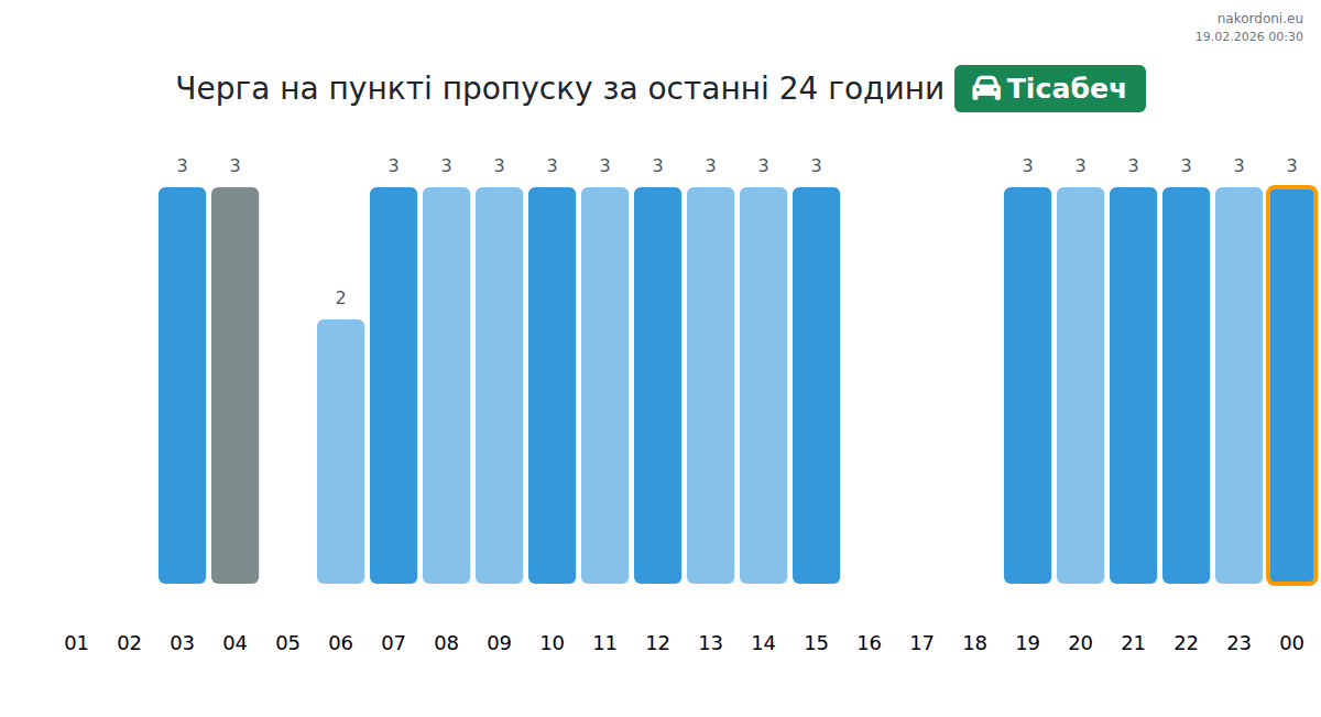 На ГКПП Тисабеч очаквайте време за изчакване за леки автомобили между 15 и 135 минути, средно 27 минути. Избягвайте пиковите часове в 09:00, 12:00 и 14:00. За по-кратки опашки, преминавайте в 15:00, 17:00 или 18:00.