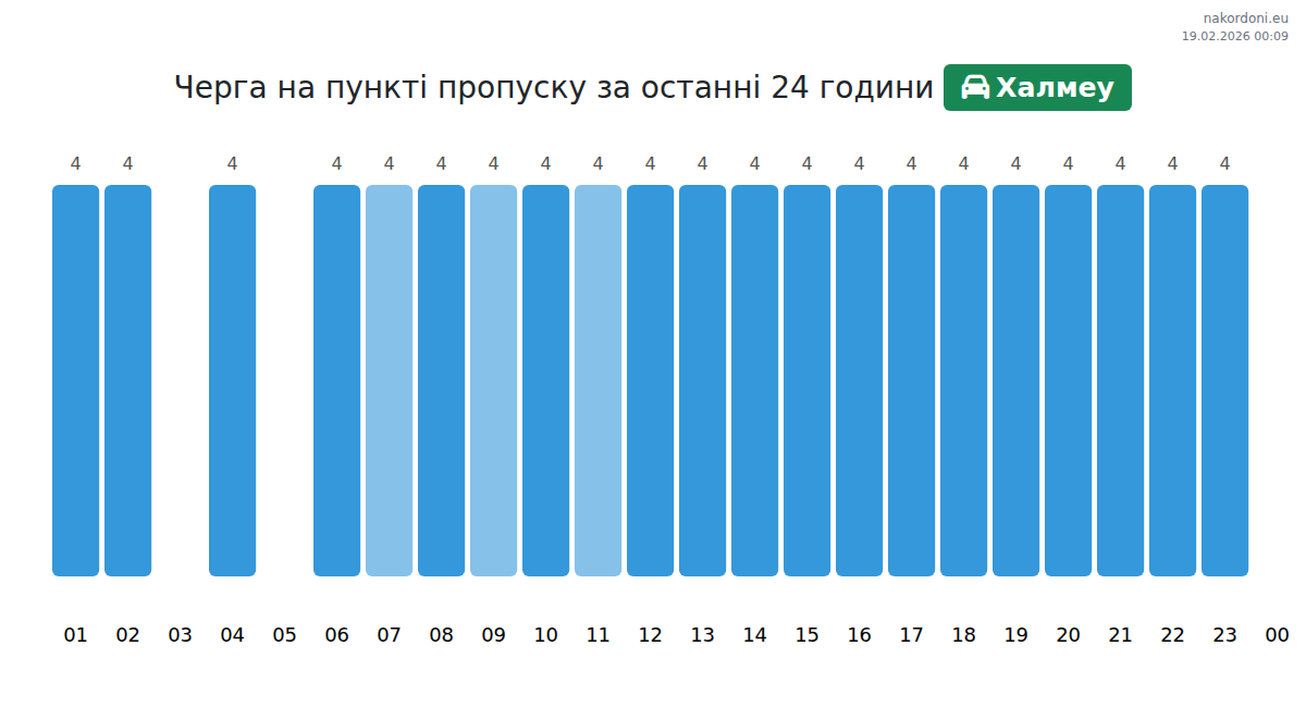 На ГКПП Халмеу очаквайте времена на изчакване от 15 до 495 минути. Избягвайте пиковите часове в 13:00, 09:00 и 17:00. Най-добрите часове за преминаване са 14:00, 15:00 и 16:00.