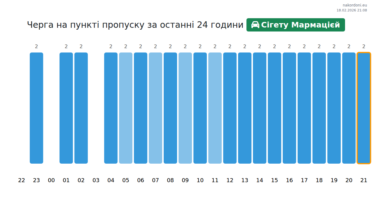 На Сигету Мармацей очаквайте време за изчакване на леки автомобили от 15 до 165 минути. Избягвайте пиковите часове около 02:00, 03:00 и 09:00. Най-кратки опашки се очакват между 14:00 и 16:00 часа.