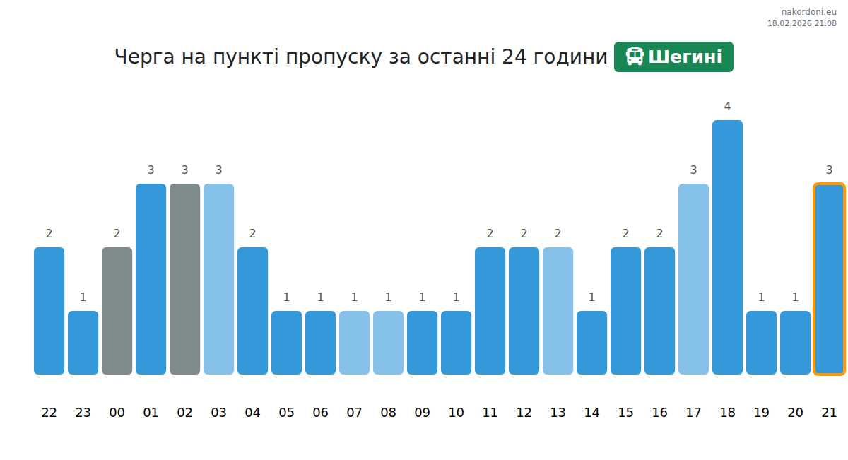 На ГКПП Шегини очакваното време за изчакване на автобуси е 15-175 минути. Избягвайте пиковите часове в 10:00, 11:00 и 13:00. За по-кратки опашки, помислете за преминаване в 05:00, 09:00 или 14:00.