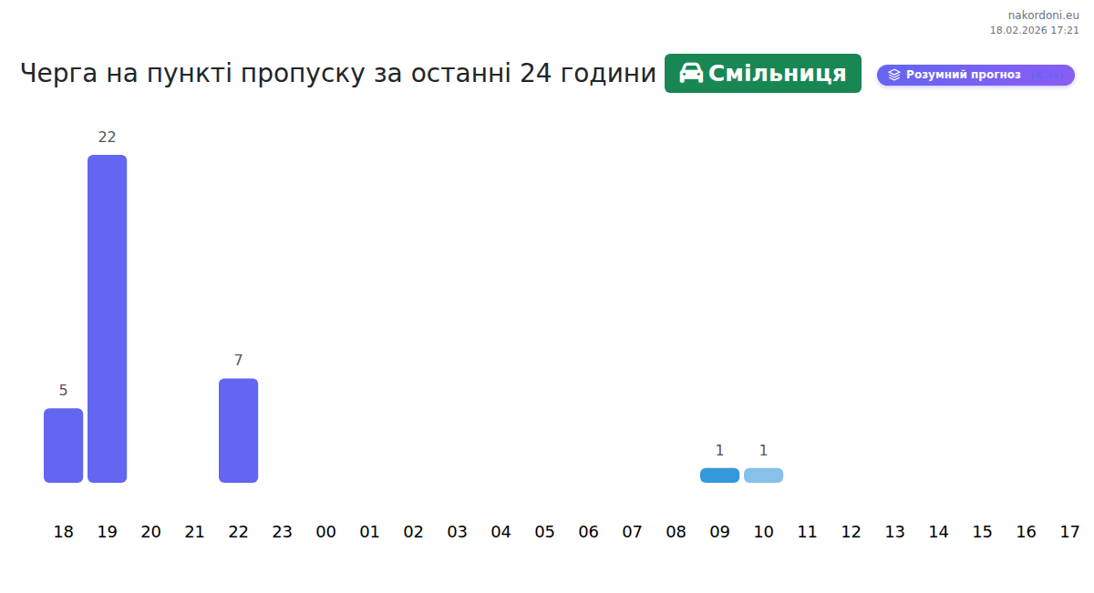 На Смильниця, очаквайте време за изчакване за леки автомобили от 15 до 189 минути. Избягвайте пиковите часове: 17:00, 11:00 и 08:00. Най-добрите часове за преминаване са 15:00, 18:00 или 21:00.