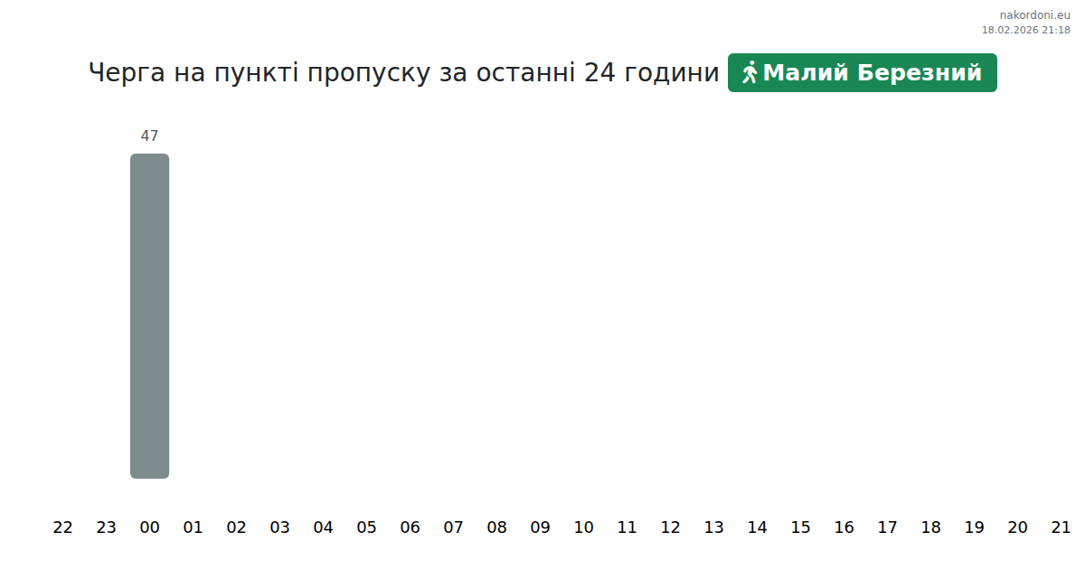 На ГКПП Малий Березний очаквайте време за изчакване на превозни средства между 15-191 минути. Избягвайте пиковите часове в 11:00, 13:00 и 22:00. Най-добрите часове за преминаване са 15:00, 17:00 и 18:00.