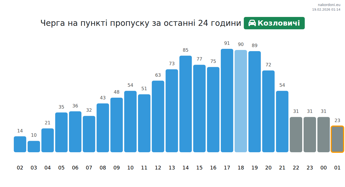 На ГКПП Козловичи се очакват значителни забавяния за леки автомобили, с време на изчакване от 95 до 1075 минути. Избягвайте преминаване между 13:00, 17:00 и 20:00 ч., тъй като това са пиковите часове. За по-кратки опашки обмислете преминаване около 04:00, 02:00 или 03:00 ч.