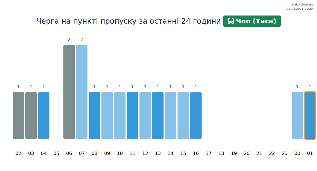 На ГКПП Чоп (Тиса) времето за изчакване на автобуси е прогнозирано между 15 и 1135 минути. Избягвайте пиковите часове: 07:00, 13:00, 11:00. По-кратки опашки се очакват около 14:00, 16:00 и 17:00.