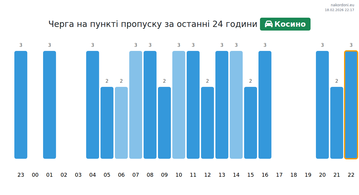 На пункт Косино, времето за изчакване за леки автомобили е 15-207 минути. Избягвайте пиковите часове: 04:00, 17:00 и 03:00. Най-доброто време за преминаване е 15:00, 18:00 и 19:00.
