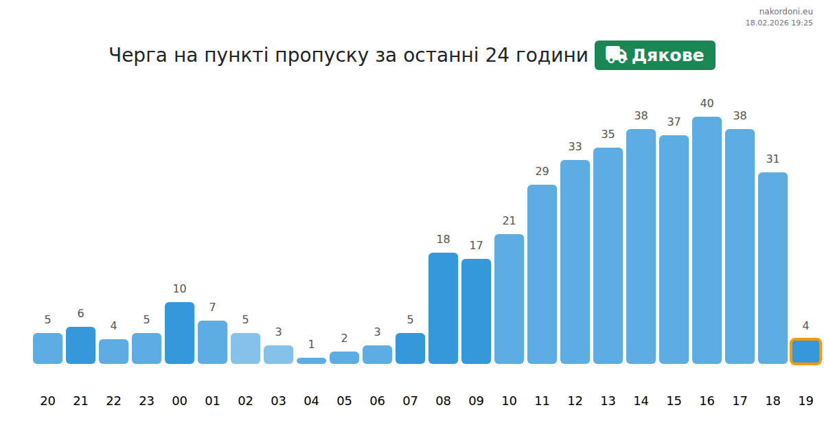 В пункт Дякове времето за чакане е между 15 и 495 минути. Избягвайте пиковите часове в 16:00, 18:00 и 00:00. Най-добрите часове за преминаване са между 02:00 и 04:00 сутринта.