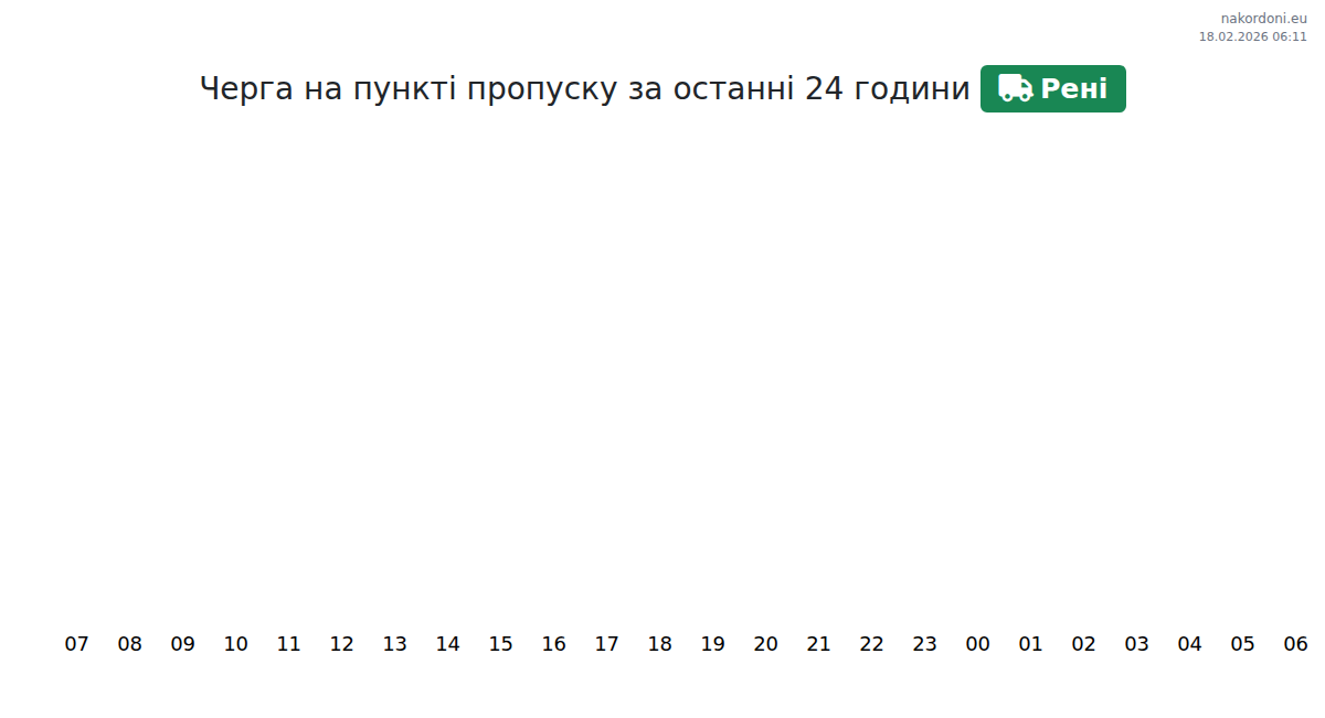 На ГКПП Рени времето за изчакване на превозни средства е между 15 и 3015 минути. Избягвайте пиковите часове между 23:00, 00:00, 01:00. Най-доброто време за преминаване с по-кратки опашки е 14:00, 15:00, 16:00.