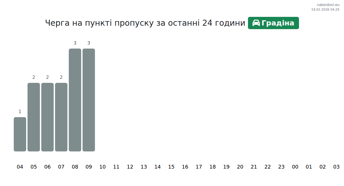 На ГКПП Градина очаквайте време за изчакване между 25-75 минути. Избягвайте пиковите часове в 10:00, 13:00 и 14:00. Най-доброто време за преминаване е 19:00, 20:00 и 21:00.
