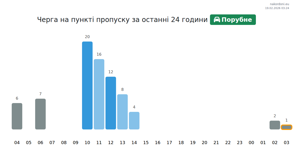 На ГКПП Порубне, чакане за коли: 15-717 мин. Избягвайте пиковите часове: 08:00, 17:00, 03:00. Най-добро време: 15:00, 18:00, 21:00.