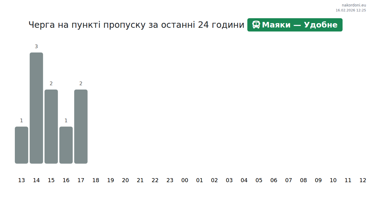 На пункт Маяки — Удобне времето за изчакване на автобуси е 15-975 минути. Избягвайте пиковите часове в 00:00, 12:00, 21:00. Най-доброто време за преминаване е 16:00, 22:00, 03:00 за по-кратки опашки.