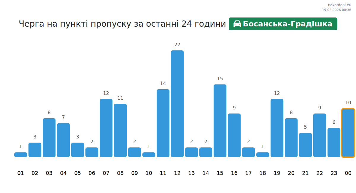 На Босанська-Градишка, за коли, очаквайте 113-197 мин. изчакване. Избягвайте пиковите часове: 08:00, 11:00, 12:00. Най-добри часове за преминаване през Босанська-Градишка: 03:00, 00:00, 01:00 за по-малки опашки.