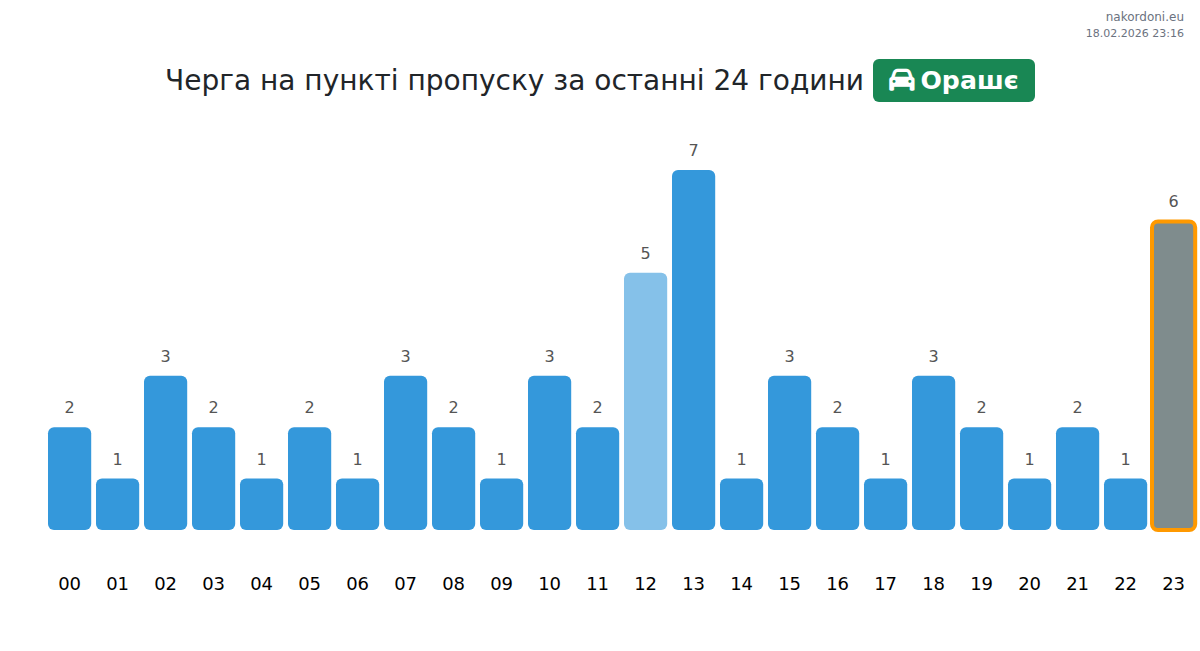 На Ораше, леките автомобили да очакват 89-143 мин. Избягвайте 09:00, 12:00, 13:00 заради пикова заетост. Най-добрите часове за преминаване са 00:00, 01:00, 02:00 за по-къси опашки.