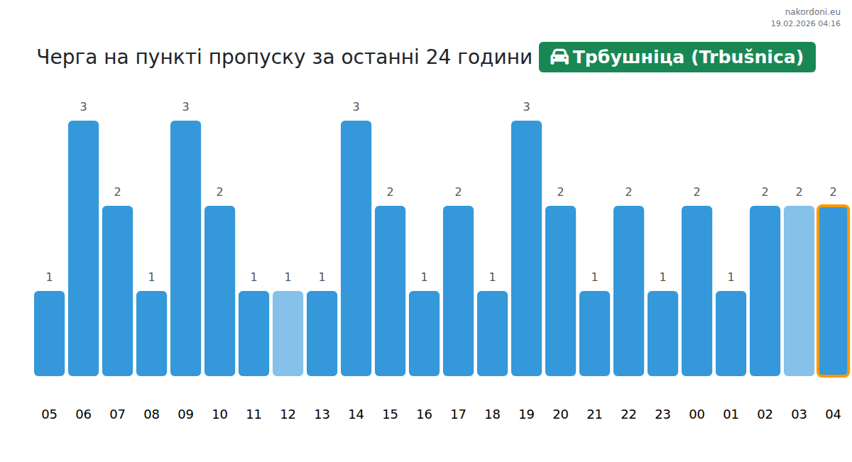 На ГКПП Трбушница (Trbušnica) очакваното време за изчакване за леки автомобили е 20-40 минути. Препоръчваме да избягвате пиковите часове: 11:00, 14:00 и 15:00. Най-доброто време за преминаване е 22:00, 23:00 или 01:00.