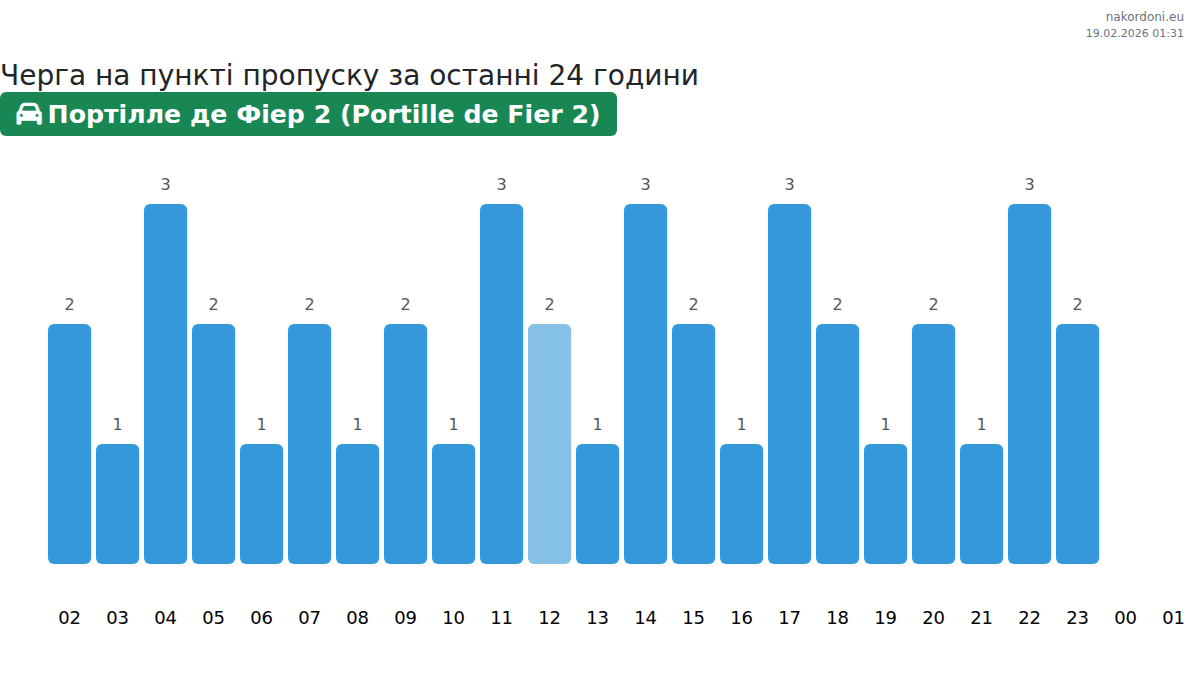 За да избегнете дълги опашки на границата на КПП Портилле де Фиер 2 (Portille de Fier 2) - лек автомобил, препоръчваме да планирате преминаването на границата в часовете с най-малко натоварване. Според данните от изминалия ден, най-малкият брой превозни средства е наблюдаван между :00 и 3:00 часа. Това е идеалното време за преминаване на границата, за да спестите време и да избегнете закъснения.