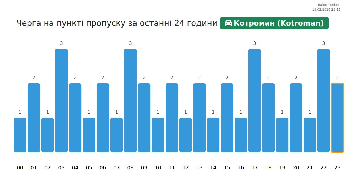 На пункта Котроман (Kotroman) времето за изчакване за леки автомобили е 20-30 минути. Избягвайте пиковите часове: 09:00, 10:00 и 14:00. Най-кратките опашки се очакват около 19:00, 20:00 или 21:00.
