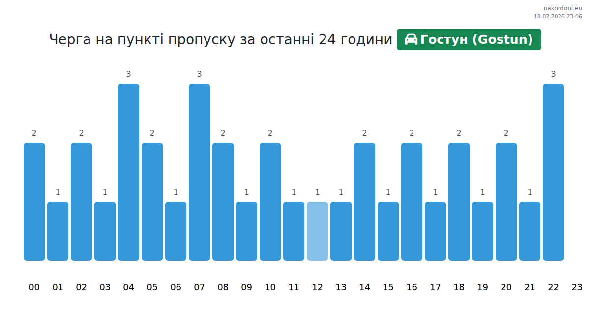За да избегнете дълги опашки на границата на КПП Гостун (Gostun) - лек автомобил, препоръчваме да планирате преминаването на границата в часовете с най-малко натоварване. Според данните от изминалия ден, най-малкият брой превозни средства е наблюдаван между 2:00 и 5:00 часа. Това е идеалното време за преминаване на границата, за да спестите време и да избегнете закъснения.