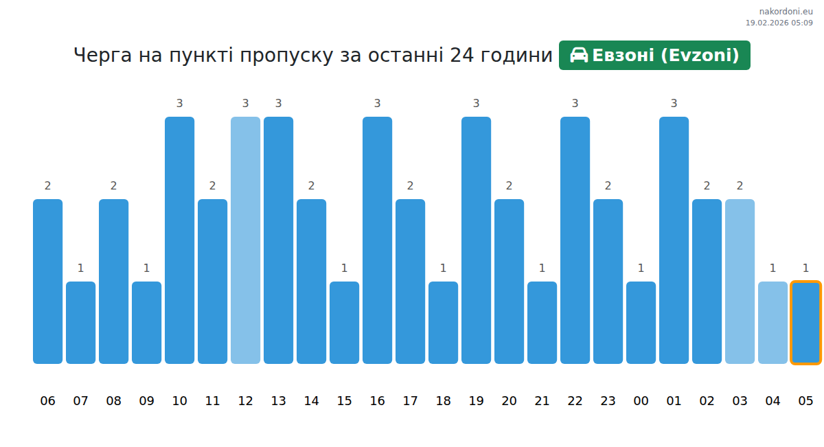 За да избегнете дълги опашки на границата на КПП Евзони (Evzoni) - лек автомобил, препоръчваме да планирате преминаването на границата в часовете с най-малко натоварване. Според данните от изминалия ден, най-малкият брой превозни средства е наблюдаван между 1:00 и 3:00 часа. Това е идеалното време за преминаване на границата, за да спестите време и да избегнете закъснения.