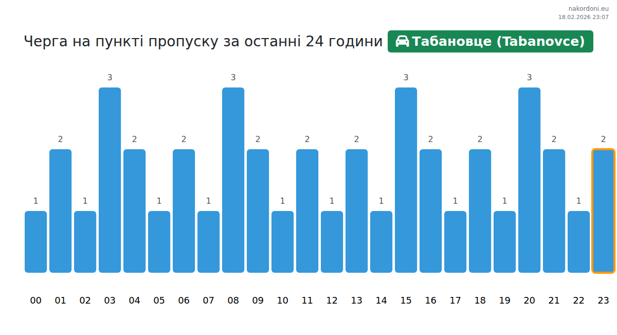 На ГКПП Табановце (Tabanovce) времето за изчакване на леки автомобили е 15-25 минути. Пиковите часове са 10:00, 15:00 и 05:00, а най-подходящото време за преминаване е в 16:00, 19:00 или 20:00 часа.