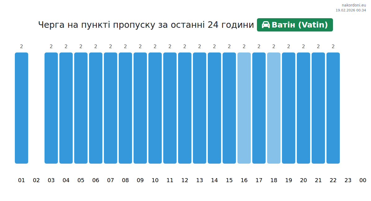 За да избегнете дълги опашки на границата на КПП Ватин (Vatin) - лек автомобил, препоръчваме да планирате преминаването на границата в часовете с най-малко натоварване. Според данните от изминалия ден, най-малкият брой превозни средства е наблюдаван между :00 и 1:00 часа. Това е идеалното време за преминаване на границата, за да спестите време и да избегнете закъснения.