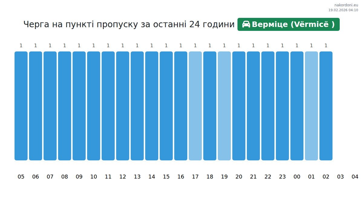 За да избегнете дълги опашки на границата на КПП Вермице (Vërmicë ) - лек автомобил, препоръчваме да планирате преминаването на границата в часовете с най-малко натоварване. Според данните от изминалия ден, най-малкият брой превозни средства е наблюдаван между :00 и 1:00 часа. Това е идеалното време за преминаване на границата, за да спестите време и да избегнете закъснения.