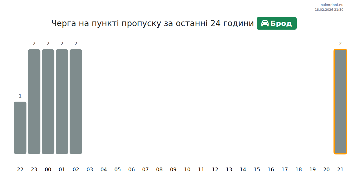 На граничния пункт Брод времето за изчакване за леки автомобили е от 71 до 119 минути. Препоръчително е да се избягват часовете пик: 11:00, 12:00 и 14:00. Най-доброто време за преминаване е 21:00, 02:00 или 03:00.