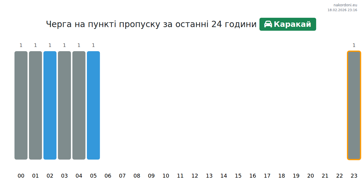 Прогнозираното време за изчакване за леки автомобили в Каракай е 71-107 минути. Избягвайте пиковите часове: 12:00, 14:00, 13:00. Най-доброто време за преминаване е 16:00, 18:00, 20:00.