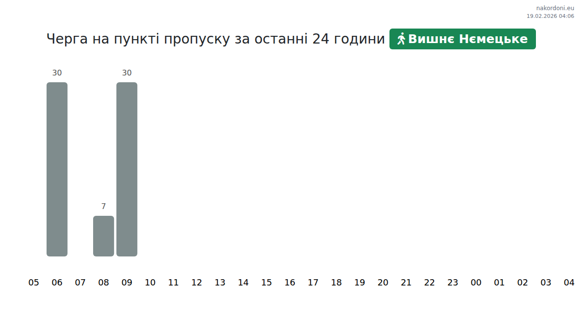 На ГКПП Вишне Немецьке прогнозираното време за изчакване на превозни средства е от 15 до 105 минути. Избягвайте пиковите часове в 22:00, 04:00 и 07:00 за по-бързо преминаване. Най-добрите часове за преминаване са 20:00, 21:00 и 23:00.