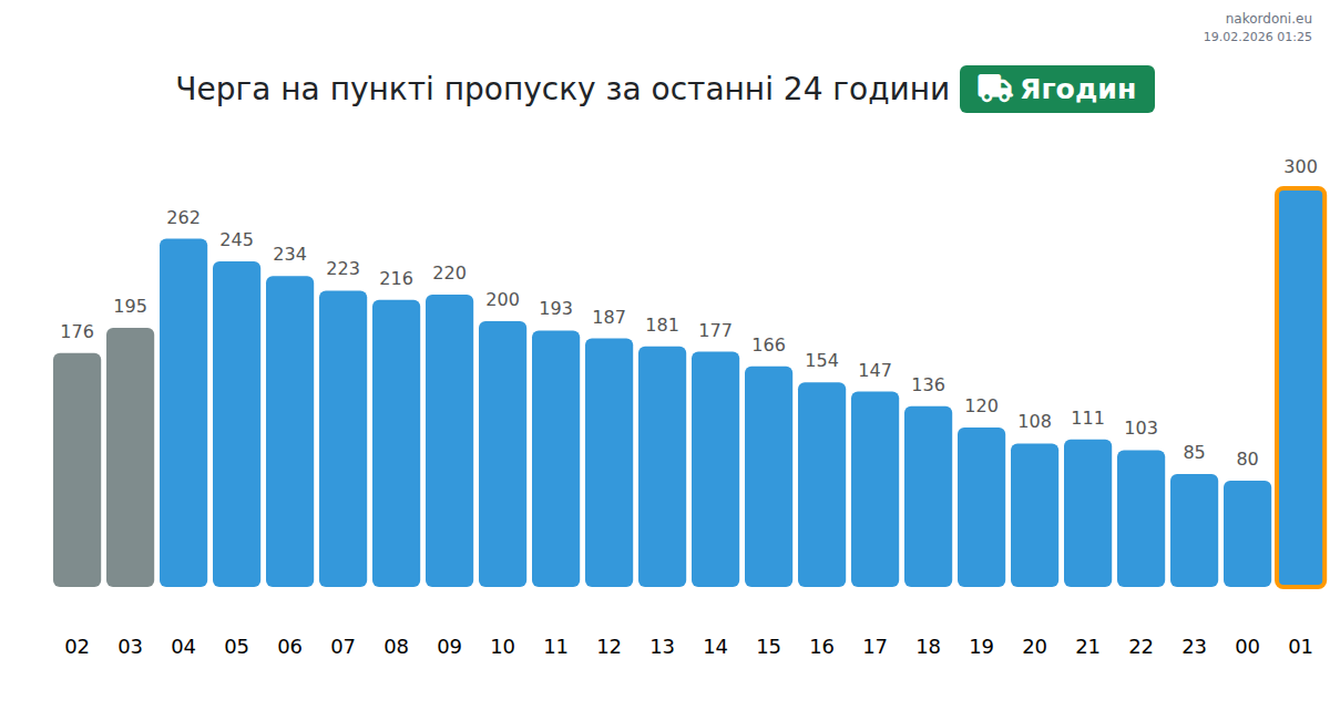 На контролно-пропускателния пункт Ягодин времето за изчакване е между 15 и 24495 минути. Избягвайте пиковите часове: 14:00, 00:00 и 01:00. Най-доброто време за преминаване е 02:00, 03:00 или 16:00.
