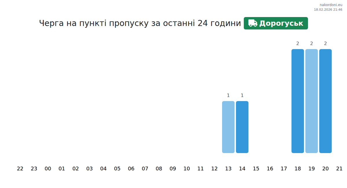 В Дорогуськ очаквайте време за изчакване от 15-495 минути. Избягвайте пиковите часове 09:00, 10:00 и 12:00. За по-кратки опашки обмислете преминаване в 11:00, 13:00 или 14:00.