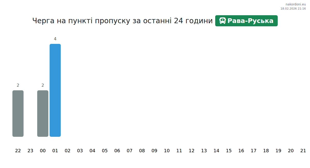 На пункт Рава-Руська за автобуси времето за изчакване е между 15 и 1055 минути. Избягвайте пиковите часове: 13:00, 02:00, 04:00. Най-доброто време за преминаване е 15:00, 18:00, 21:00.