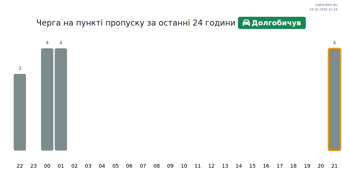 На Долгобичув очаквайте време за изчакване на леки автомобили между 15-75 минути. Избягвайте пиковите часове в 17:00, 03:00 и 02:00. Най-кратки опашки се прогнозират за 22:00, 04:00 и 05:00.