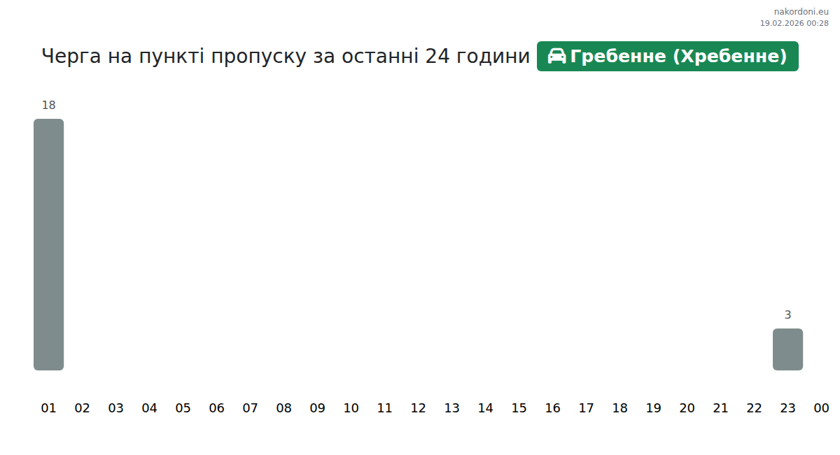 На ГКПП Гребенне (Хребенне) за леки автомобили се прогнозират опашки от 15-105 минути. Избягвайте пиковите часове: 18:00, 01:00, 00:00. Най-доброто време за преминаване е 15:00, 02:00 и 03:00.