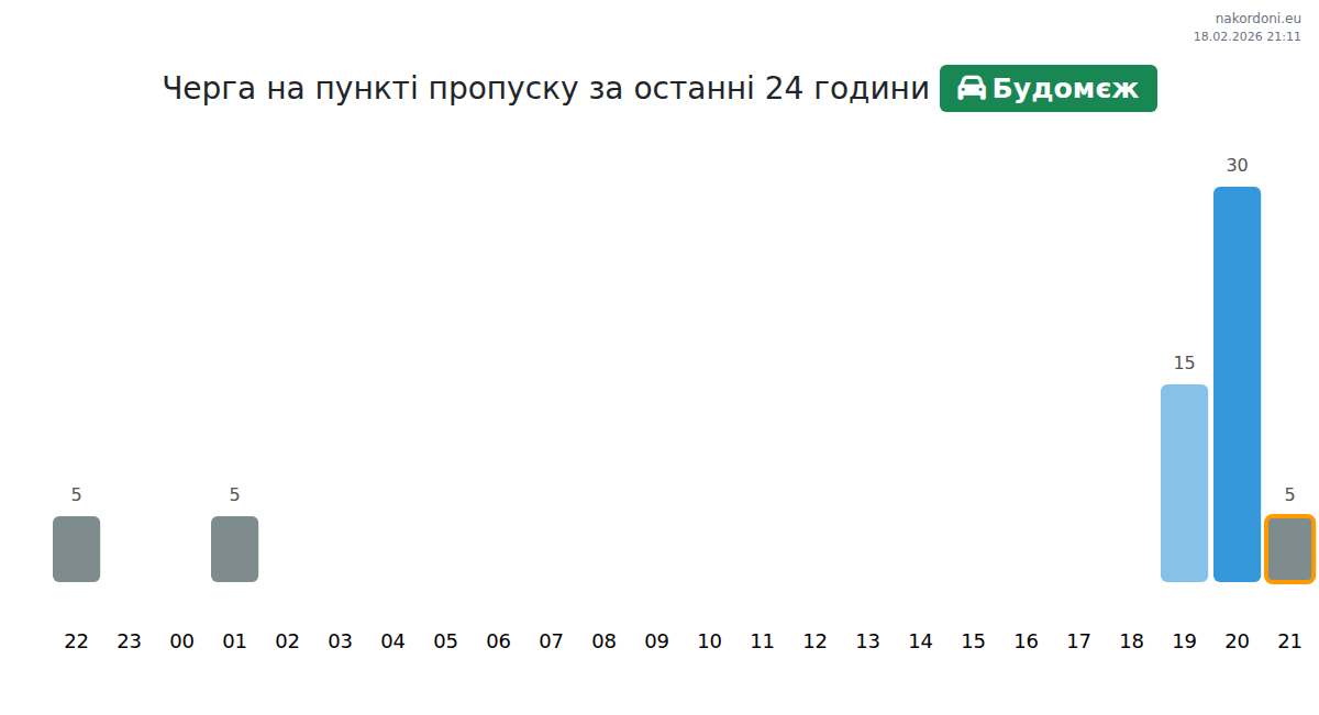 На ГКПП Будомеж времето за изчакване на леки автомобили е между 15-75 минути. За да избегнете най-дългите опашки, е препоръчително да не преминавате в 14:00, 16:00 и 18:00 часа. За по-кратко изчакване обмислете преминаване между 22:00, 03:00 или 04:00 часа.