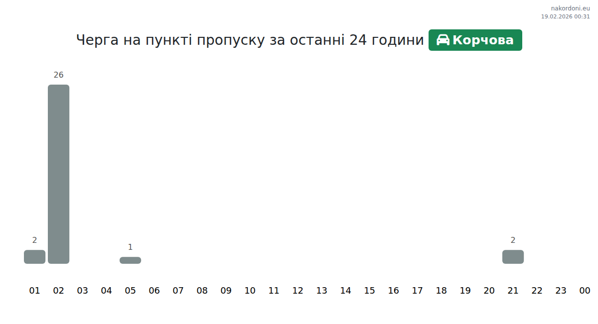 На ГКПП Корчова, очакваните времена за изчакване за леки автомобили са от 15 до 1055 минути, със средно 128 минути. Препоръчително е да избягвате пиковите часове около 20:00, 23:00 и 01:00. За по-кратки опашки, помислете за преминаване в 19:00, 21:00 или 02:00.