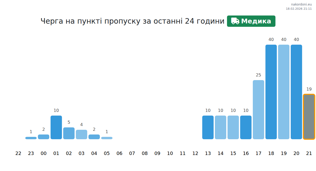 На Медика времето за чакане за превозни средства е 15-159 минути. Избягвайте пиковите часове в 14:00, 08:00 и 20:00 ч. Най-доброто време за бързо преминаване на границата е в 16:00, 17:00 и 18:00 ч.