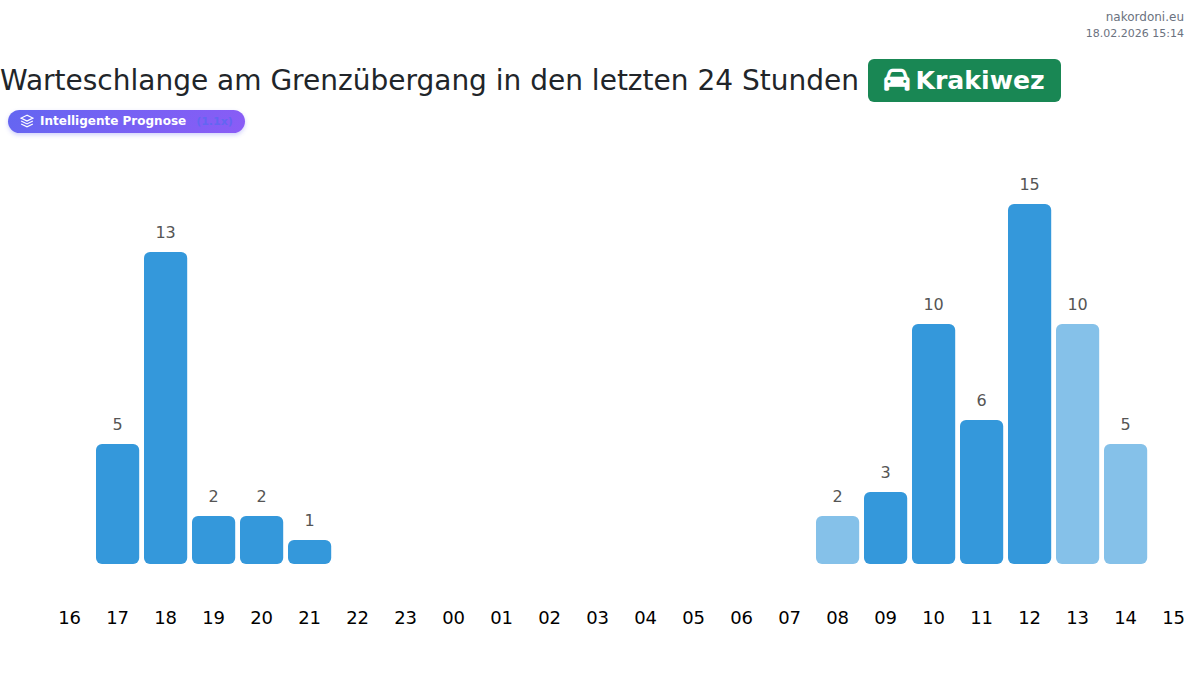 Am Grenzübergang Krakiwez beträgt die Wartezeit voraussichtlich zwischen 15 und 123 Minuten. Vermeiden Sie Stoßzeiten um 21:00, 19:00 und 17:00 Uhr. Die besten Zeiten sind 00:00, 01:00 oder 05:00 Uhr.