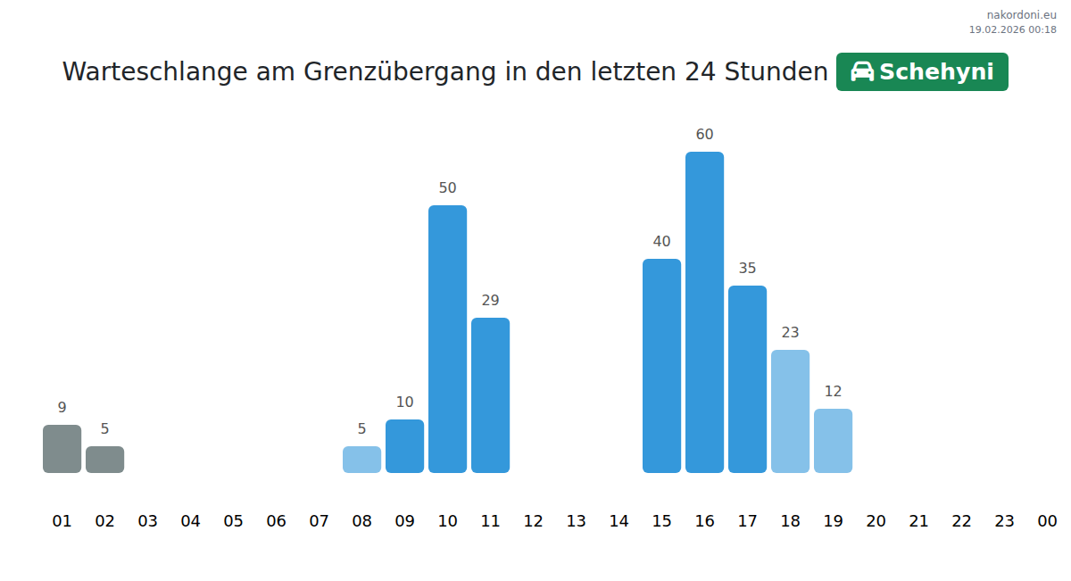 Am Grenzübergang Schehyni werden Wartezeiten für Personenkraftwagen von 15 bis 147 Minuten erwartet. Vermeiden Sie Stoßzeiten um 22:00, 10:00 und 13:00 Uhr. Die besten Überfahrtszeiten sind 01:00, 02:00 oder 05:00 Uhr.