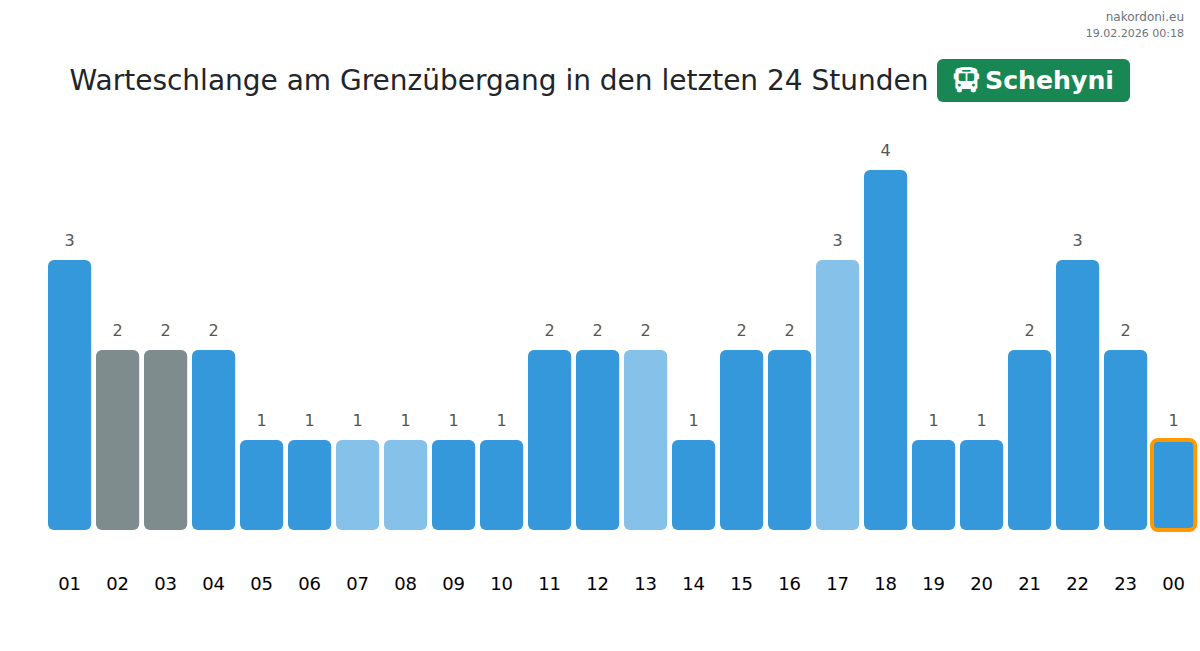 Am Grenzübergang Schehyni wird eine Wartezeit für Busse von 15-175 Minuten erwartet. Vermeiden Sie die Stoßzeiten um 10:00, 11:00 und 13:00 Uhr. Für kürzere Wartezeiten empfehlen wir die Überquerung um 05:00, 09:00 oder 14:00 Uhr.