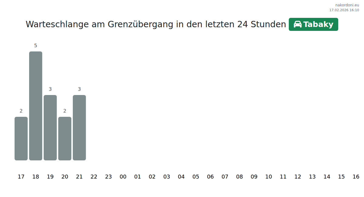 Am Grenzübergang Tabaky beträgt die Wartezeit für PKW 15-39 Minuten. Meiden Sie die Stoßzeiten um 12:00, 13:00 und 07:00 Uhr. Die besten Zeiten sind 20:00, 21:00 oder 23:00 Uhr.
