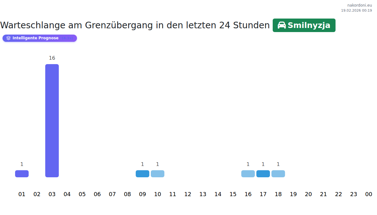 Am Grenzübergang Smilnyzja beträgt die Wartezeit für Pkw zwischen 15 und 189 Minuten. Meiden Sie die Stoßzeiten um 17:00, 11:00 und 08:00 Uhr. Günstigere Zeiten sind 15:00, 18:00 oder 21:00 Uhr.