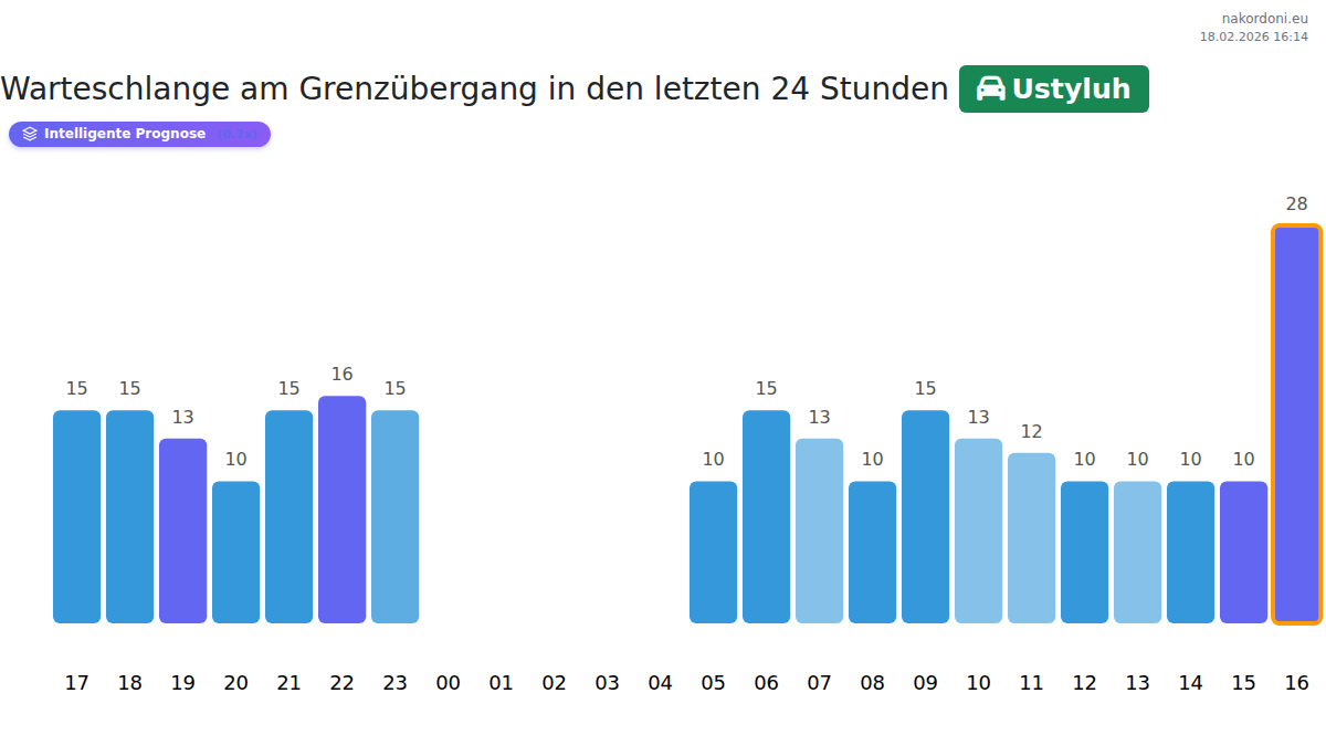 In Ustyluh können Personenkraftwagen eine Wartezeit von 35-67 Minuten erwarten. Meiden Sie Stoßzeiten um 17:00, 18:00 und 20:00 Uhr. Die besten Zeiten sind 23:00, 03:00 und 05:00 Uhr für kürzere Schlangen.