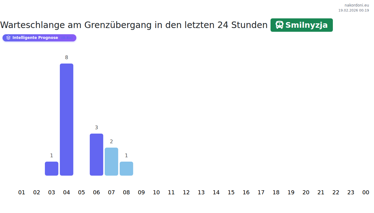 Am Grenzübergang Smilnyzja werden Wartezeiten für Busse von 15 bis 575 Minuten erwartet. Meiden Sie die Stoßzeiten um 02:00, 03:00 und 14:00 Uhr. Günstigere Zeiten sind 15:00, 16:00 oder 18:00 Uhr.