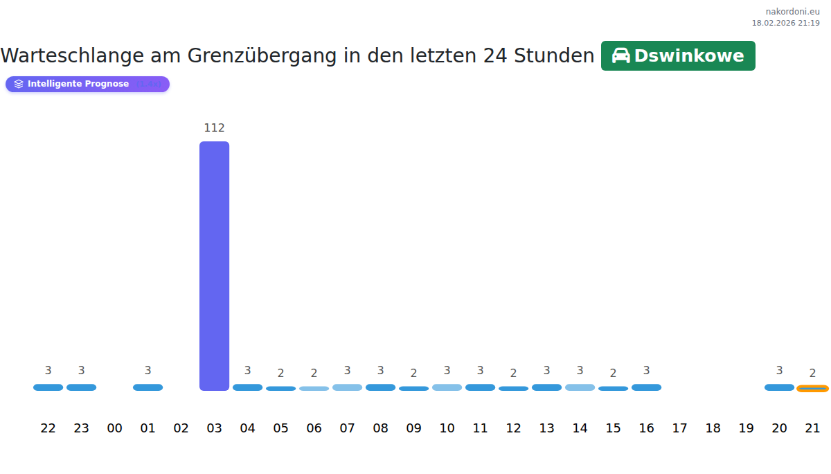 Planen Sie Ihre Reisen im Voraus und nutzen Sie aktuelle Informationen über die Warteschlangen an der Grenze am Grenzübergang Dswinkowe - Personenkraftwagen, um Ihren Grenzübertritt schnell und bequem zu gestalten. Achten Sie besonders auf diese Stunden, um Stoßzeiten zu vermeiden und die Wartezeiten zu verkürzen.