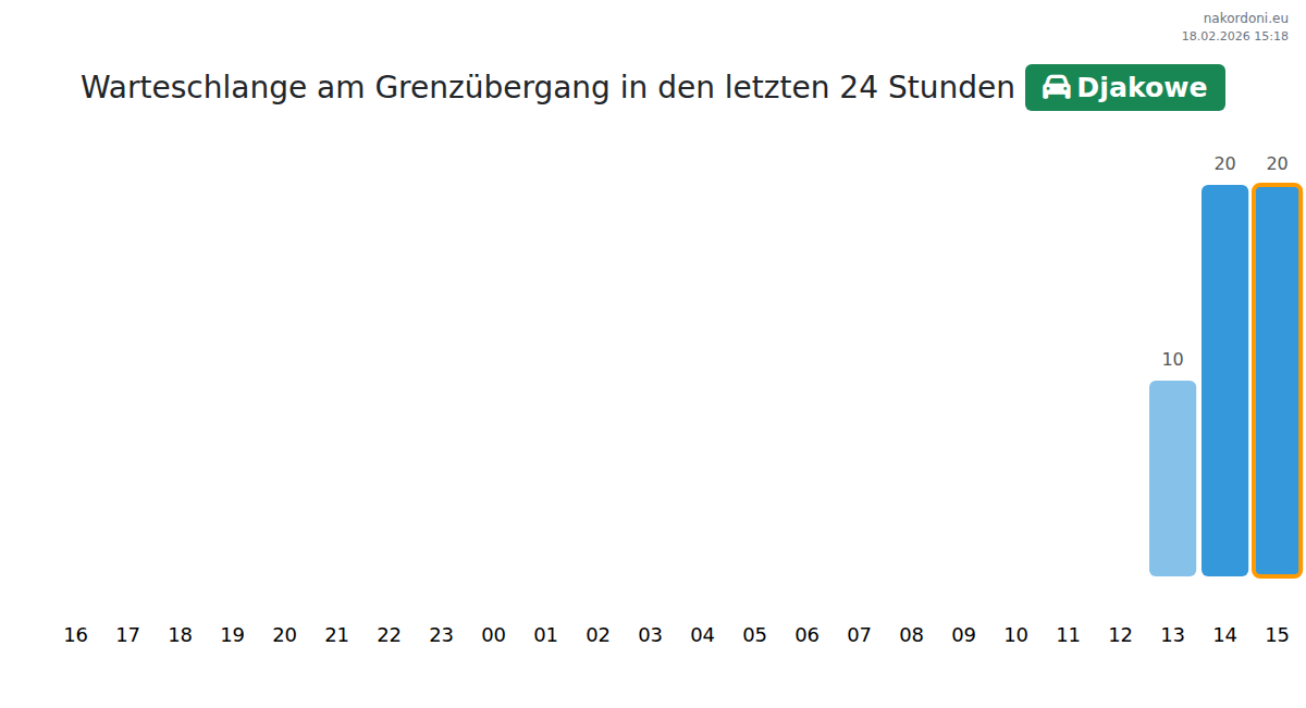 Am Grenzübergang Djakowe beträgt die Wartezeit 15-63 Min. Stoßzeiten sind um 08:00, 13:00 und 02:00 Uhr. Die besten Zeiten für die Überfahrt sind 10:00, 12:00 oder 14:00 Uhr.
