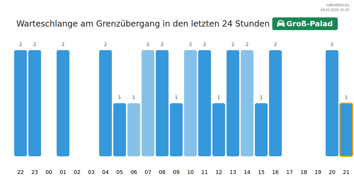 Planen Sie Ihre Reisen im Voraus und nutzen Sie aktuelle Informationen über die Warteschlangen an der Grenze am Grenzübergang Groß-Palad - Personenkraftwagen, um Ihren Grenzübertritt schnell und bequem zu gestalten. Achten Sie besonders auf diese Stunden, um Stoßzeiten zu vermeiden und die Wartezeiten zu verkürzen.